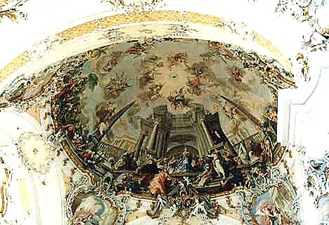 Als gewaltiges Kuppelgemälde z.B. in Ottobeuren, wo die vier Weltgegenden illusionistisch einbezogen werden (J.J.Zeiller, ca. 1760; das Bild sei herzlich eineR TouristIn verdankt!).