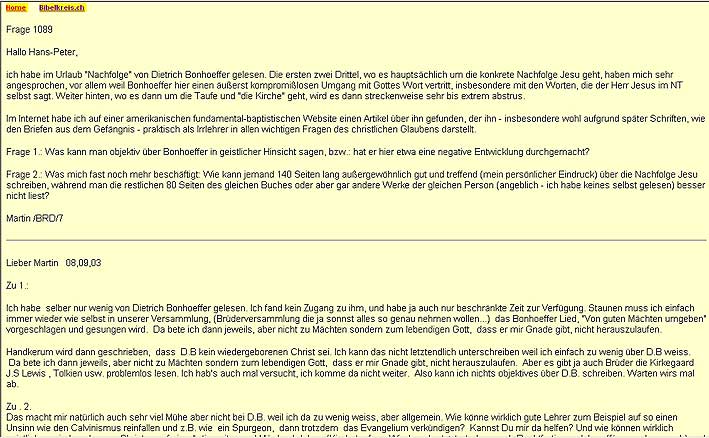 Sehr nachdenklich macht dieser Web-Fund aus den "bibelkreis.ch"-Antworten, der zeigt, wie sehr Bonhoeffer auch heute noch missverstanden werden kann, - wenn man sich nicht die Mühe nimmt, ihn direkt und im Kontext seiner Geschichte zu lesen. – Das berühmte Neujahrs-Gedicht auf das Jahr 1945 "Von guten Mächten …" kann man wohl nur sehr engstirnig so interpretieren.