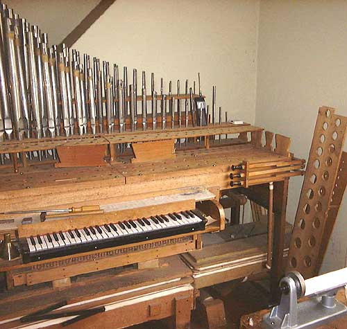 Drei Bilder von der Intonationslade, einer "Probeorgel" mit Gebläse (unten), drei Registerzügen (rechts), einem Manual - und vor allem dem Referenz-Register (hinten), nach dem die Pfeifen gestimmt werden, hier Lippenpfeifen.