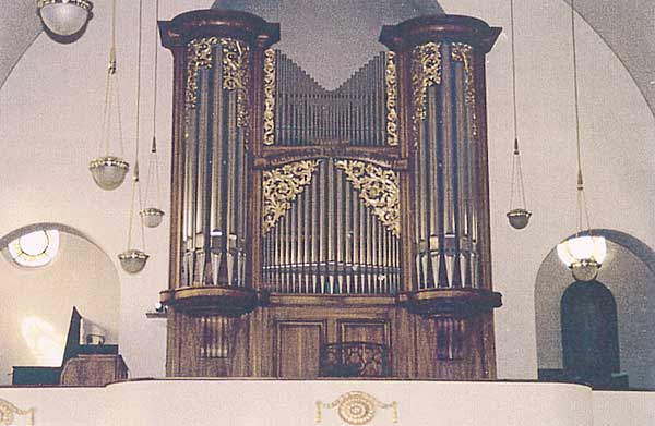 Elektropneumatische Metzler-Orgel in St.Agatha / Dietikon ZH (Bild: zVg); links rechtwinklig abgesetzt der Spieltisch, womit optimale Sichtverbindung zum liturgischen Geschehen gegeben ist.