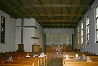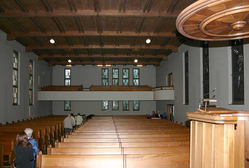 Innenraum, nach SW: Kanzel, Abendmahlstisch, Orgel.