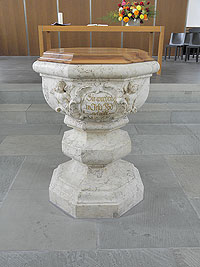 Rokoko-Taufstein von 1773, aus Schleitheimer Alabaster, mit figürlichem Relief und Spruch aus Röm 6.